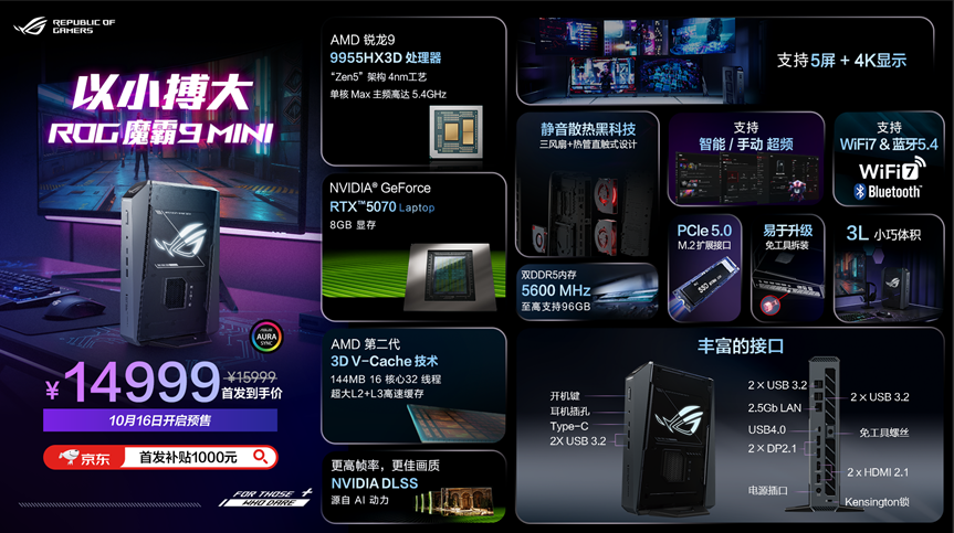 凭借 “小体积、强性能” 广受玩家喜爱的ROG迷你主机,今天为玩家们又送上一份惊喜礼物 —— 全新 ROG 魔霸 9 Mini。首款搭载 AMD Ryzen 9 9955HX3D的电竞迷你主机,9955HX3D拥有 16 核 32 线程,最高加速频率可达 5.4GHz;采用第二代 3D V-Cache 技术,高达144MB的高速二级和三级缓存,堪称移动端处理器性能天花板。搭载的RTX 5070 移动端独立显卡,支持 DLSS 4 AI 帧生成技术,满血性能释放状态下帧率稳定画质上乘。魔霸9 Mini仅仅3L的小巧机身,将美学观感和优化散热风道巧妙结合,同时整机支持免工具开启,拓展维护非常方便。它搭载5600MHz DDR5内存、还拥有PCIe5.0 M.2硬盘接口和WiFi7网卡,为玩家提供超快的数据传输速率。散热方面,ROG 魔霸9 mini 采用全新三风扇+热管直触式散热设计,让热传导效率更高,散热无忧的同时又能稳定安静的运行,运行高负载的3A游戏时噪音也只有微弱的噪音。堪比台式机的丰富接口拉满拓展性,最多支持5个4K显示器输出,还拥有速率高达40Gbps的USB4接口和满血HDMI 2.1及DP2.1接口。魔霸9 Mini强大的游戏性能表现和综合实力。专为追求游戏表现的玩家而生!