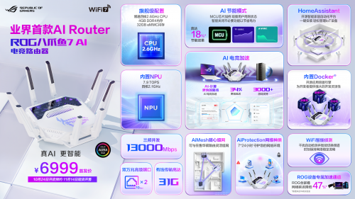 该路由器采用了创新三核架构(CPU+NPU+MCU协同),在行业内首次导入NPU,拥有7.9 TOPS算力与四核2.1GHz架构,实现了真正的AI智能路由。其AI电竞加速引擎以QoE为核心,智能优化流量,实现更低游戏延迟,支持多达3000多款热门游戏的优化;AI节能模式则通过搭载MCU芯片,实时感知用户用网状态,智能关闭非必要的功能以节省电力,至高可达18%的节能效果。更引人注目的是,ROG八爪鱼7 AI算力充裕,它的系统支持内置Docker,为开发者提供高度灵活的开发环境,同时能一键安装HomeAssistant开源智能家居自动化平台,让用户轻松管理不同品牌的loT设备。这款ROG八爪鱼7 AI电竞路由将于2025年10月24日开启预约,2025年11月14日正式开售,售价为6999元。